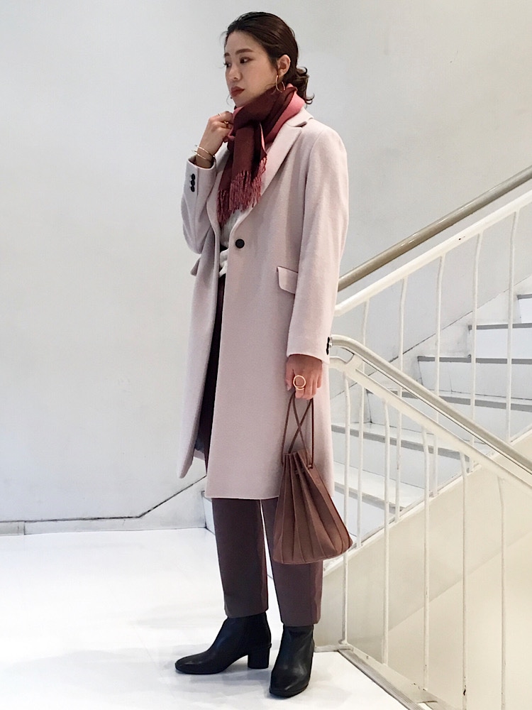 マニッシュなコーデの中にも、色味のアイテムで女性らしさをプラス♪