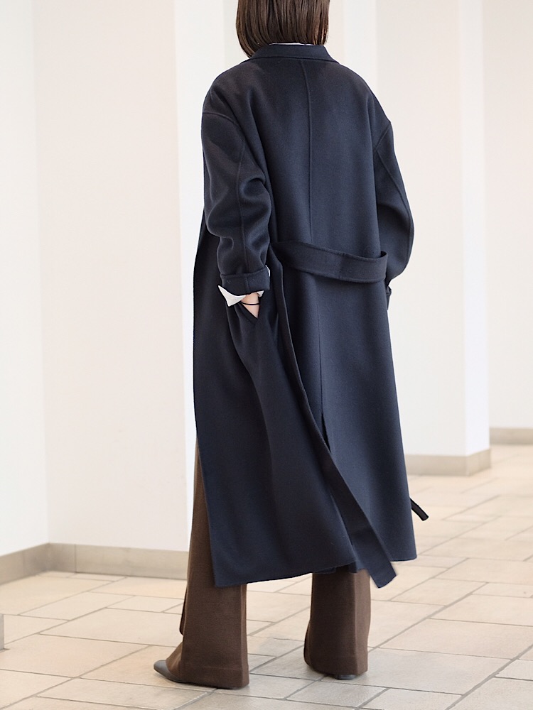 オーバーサイズのコートを敢えてサイズアップし、ドレープ感を出してコーディネート