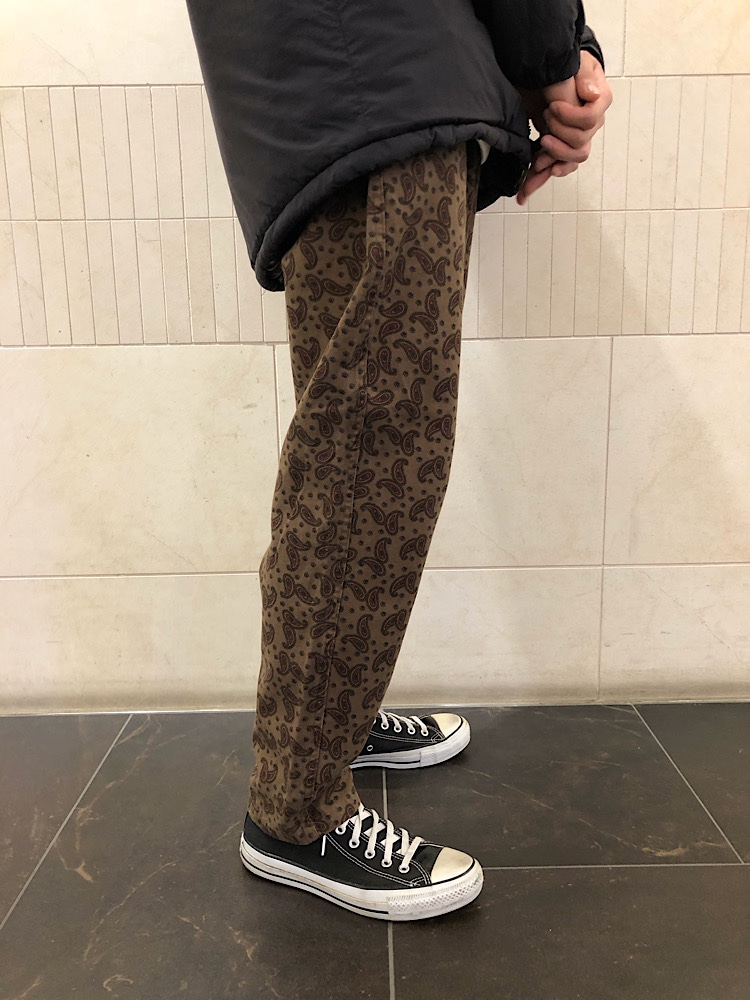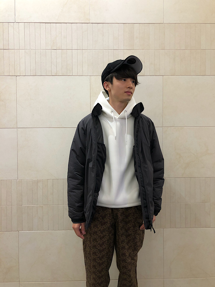 マコバーのパンツを主役にした冬のコーディネートです。パンツの柄が映えるように他のアイテムは無彩色のものでまとめました。