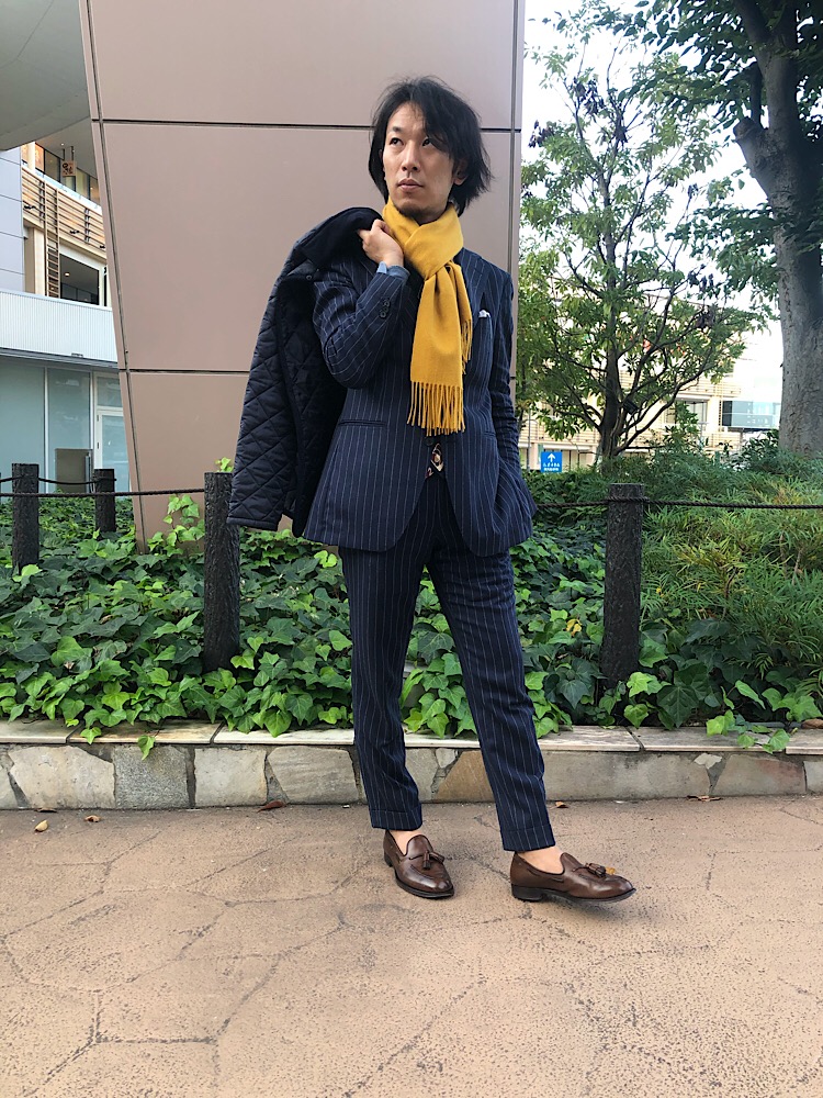 サイズ感:比較的細めなサイズ感だが肩周りはジャケットを着用してもストレスのない適度なゆとりあり