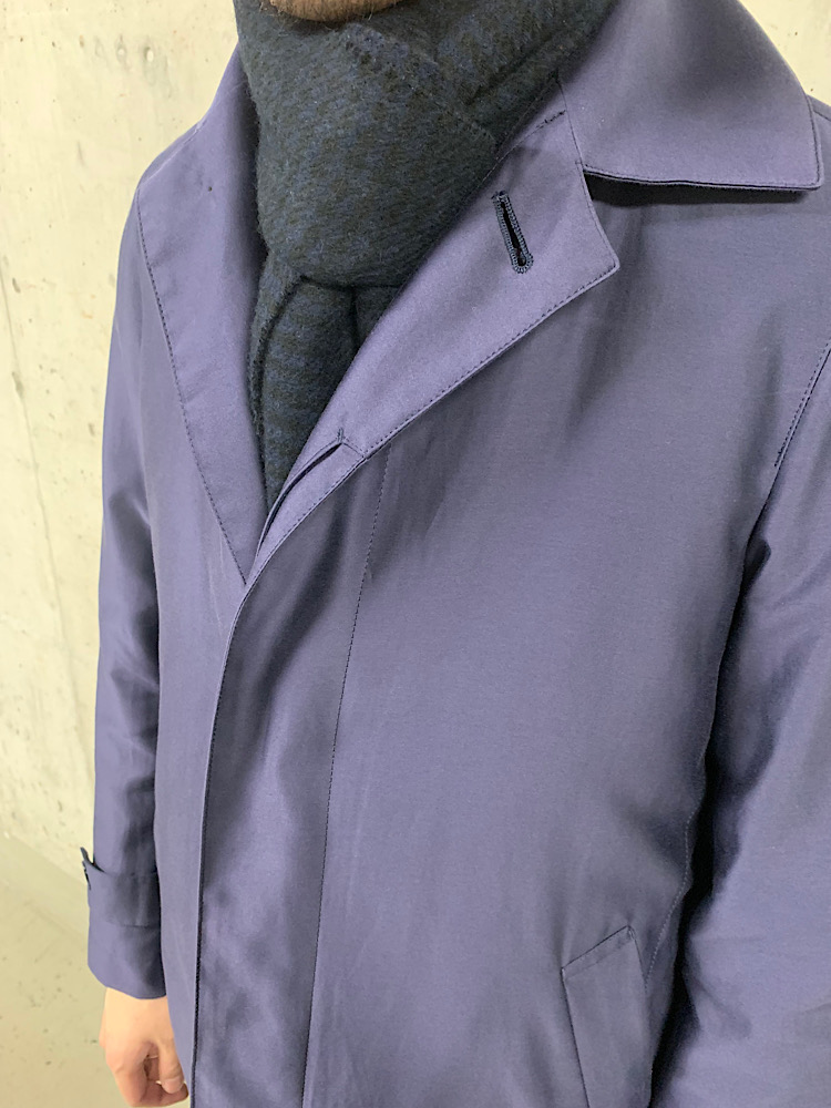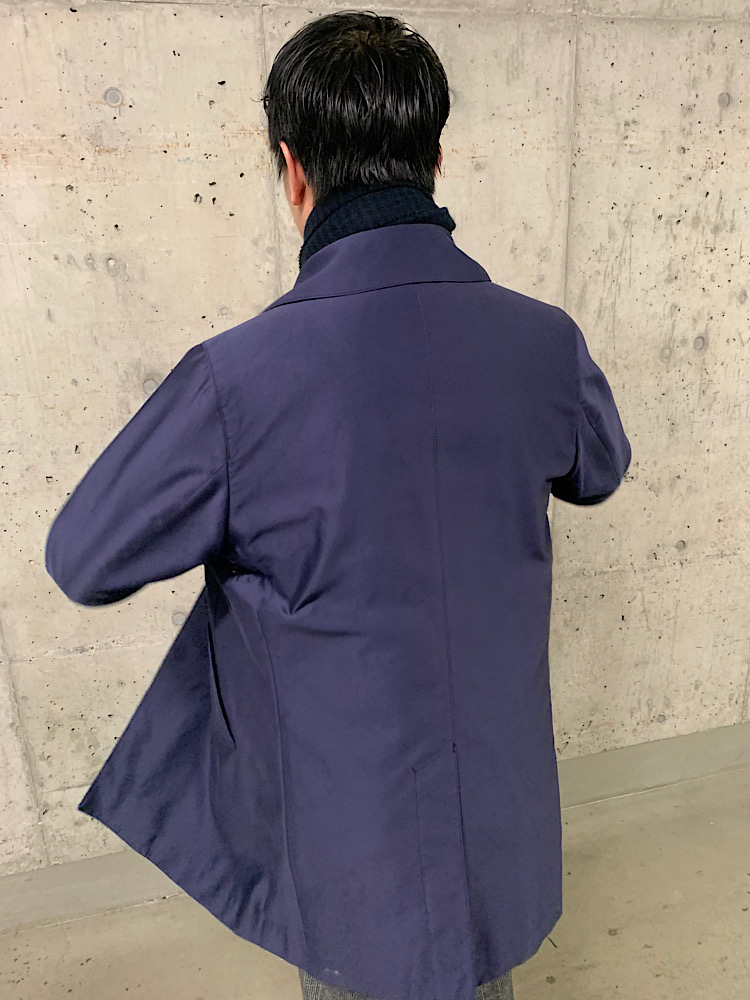 サイズ感: ジャケットの上から羽織れるゆとりは保ちながら着丈や身幅がスッキリと細いため脇の下からストンと落ちる細身なシルエットが出やすい。