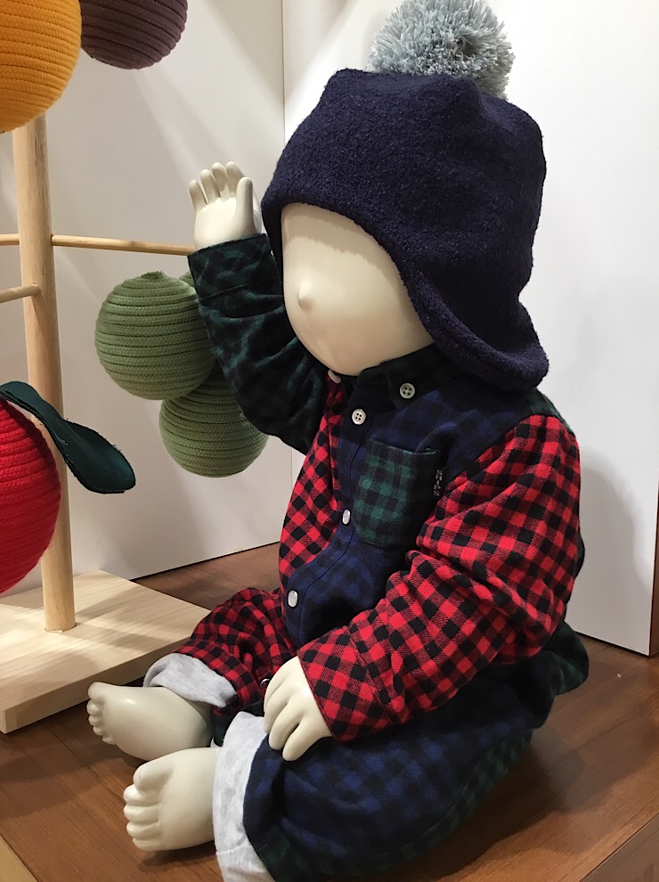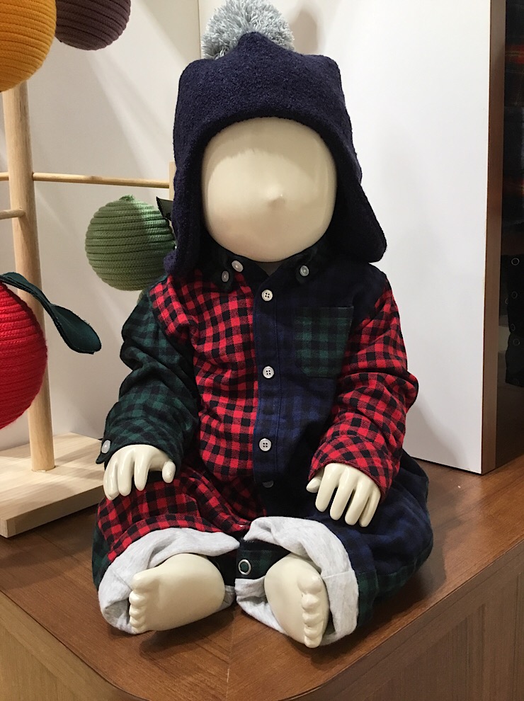 ネル生地が組み合わさったシャツロンパース。 裏地に天竺を使用しているので、肌触りがよく、フロントも脱衣しやすいスナップ使用になっています。 耳まで暖かい帽子もおすすめです。