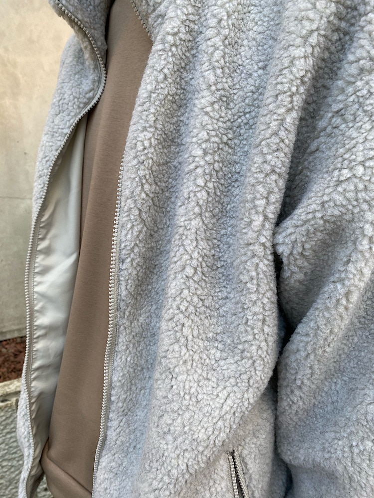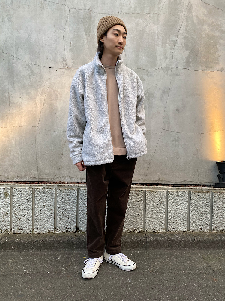 ボアジャケットをサイズ上げてオーバーサイズに着てカジュアルにスタイリングしました。今期流行りのコーデュロイも合わせ流行り感も出してます。