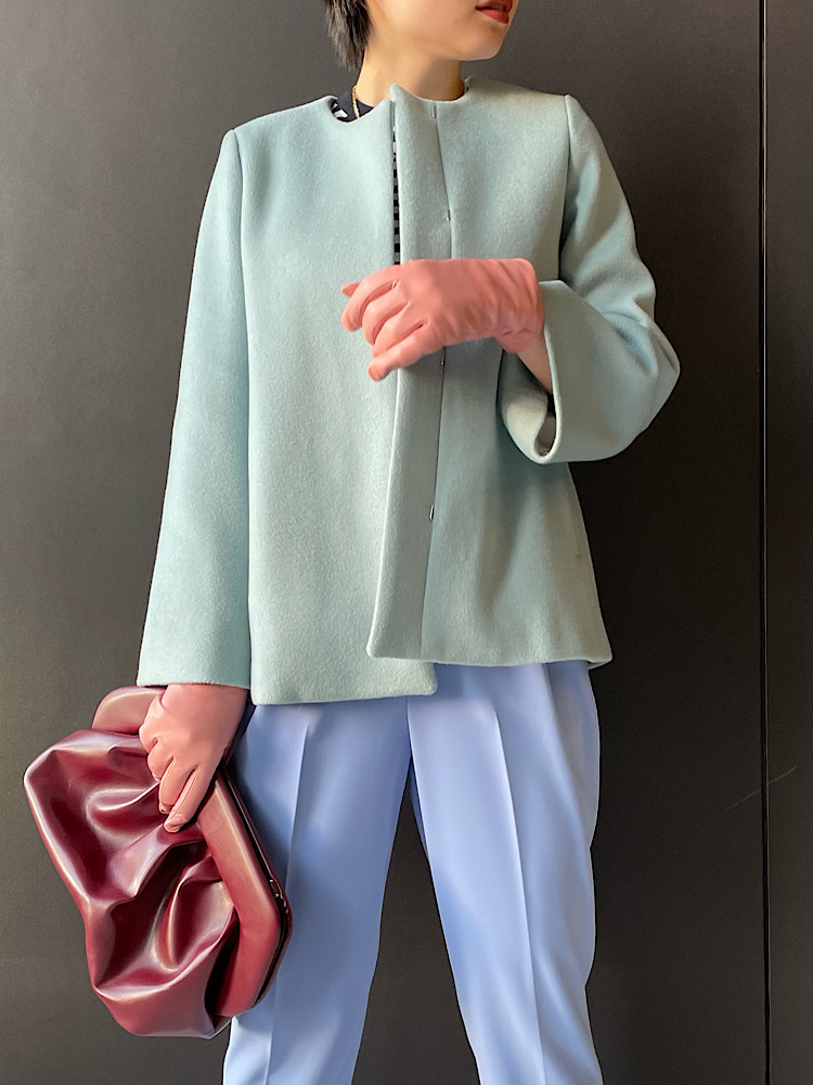ウェアはクールトーンでまとめましたが、ひんやりした印象になりすぎないように赤のバッグとピンクの手袋でカラーバランスをとりました◎
