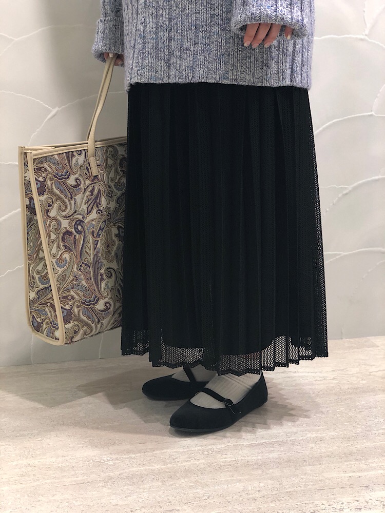 着心地:プリーツ×レースでインパクトありますが、ベーシックカラーなのでカラートップスとの相性も抜群です。自然な女性らしいデザインになってます。