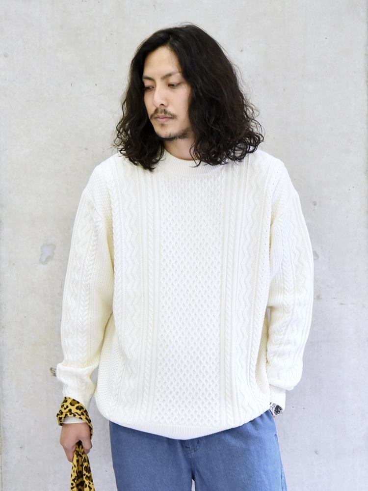 程よいリラックス感のあるランダムアラン柄のモックネックニット