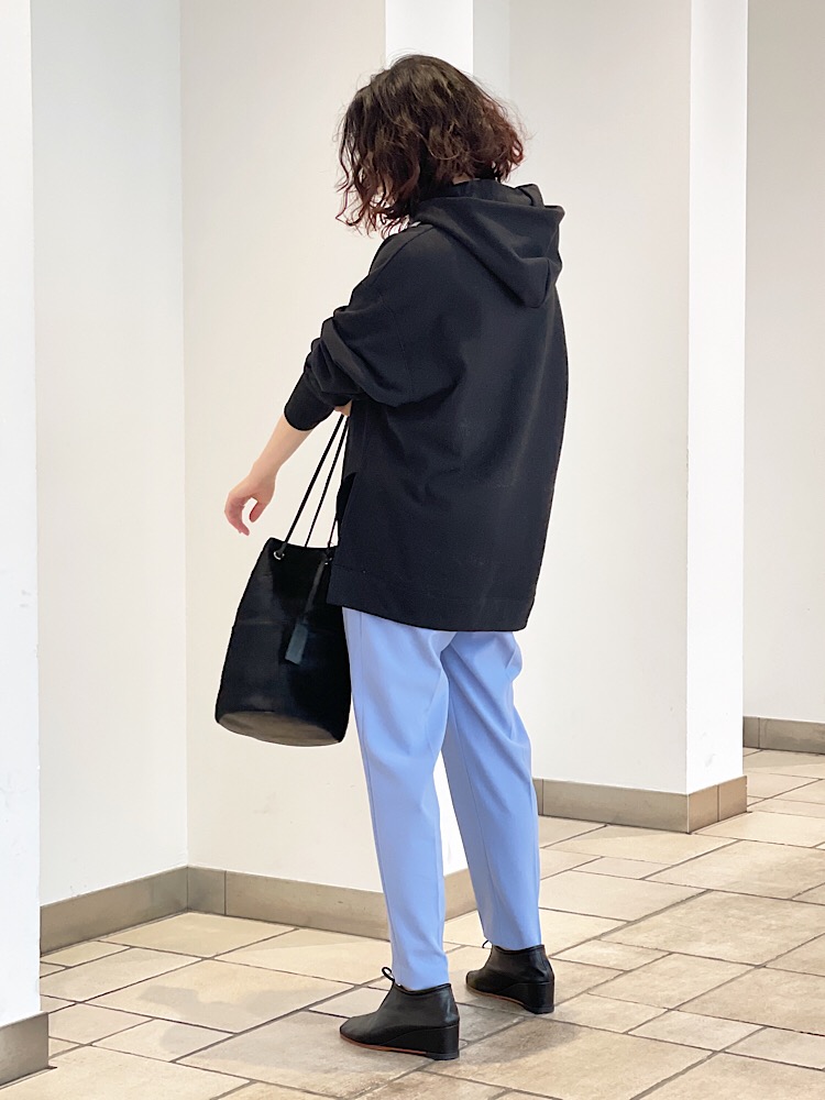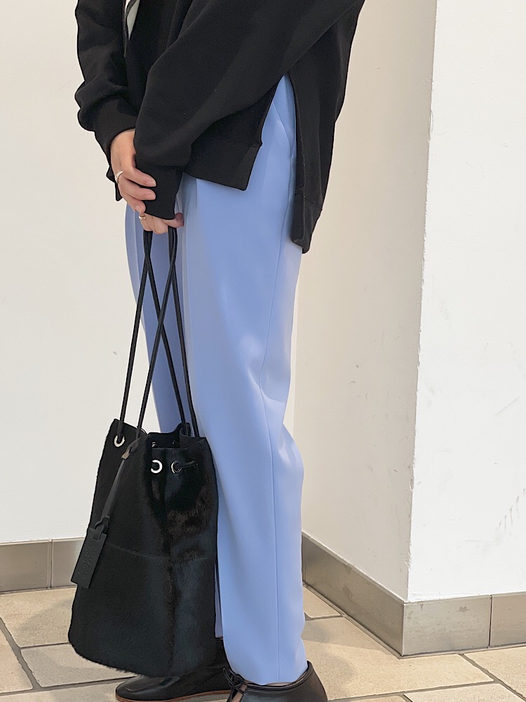 素材感・着心地:裏地なし。ややしっかりしたハリコシある、とろみ生地でスッキリしたテーパードシルエット。。