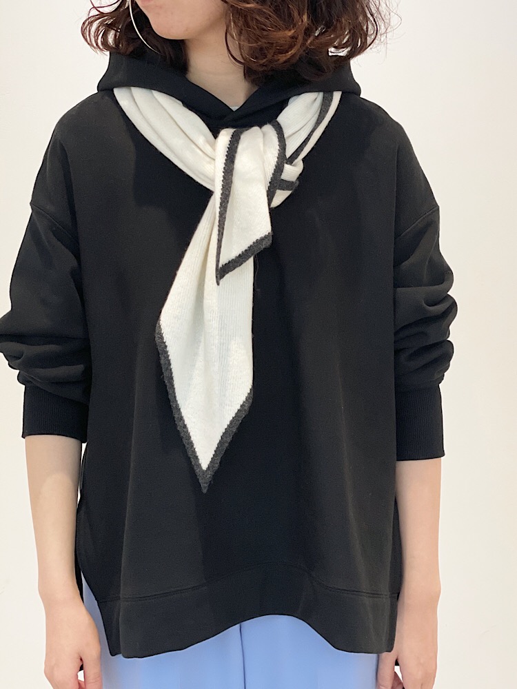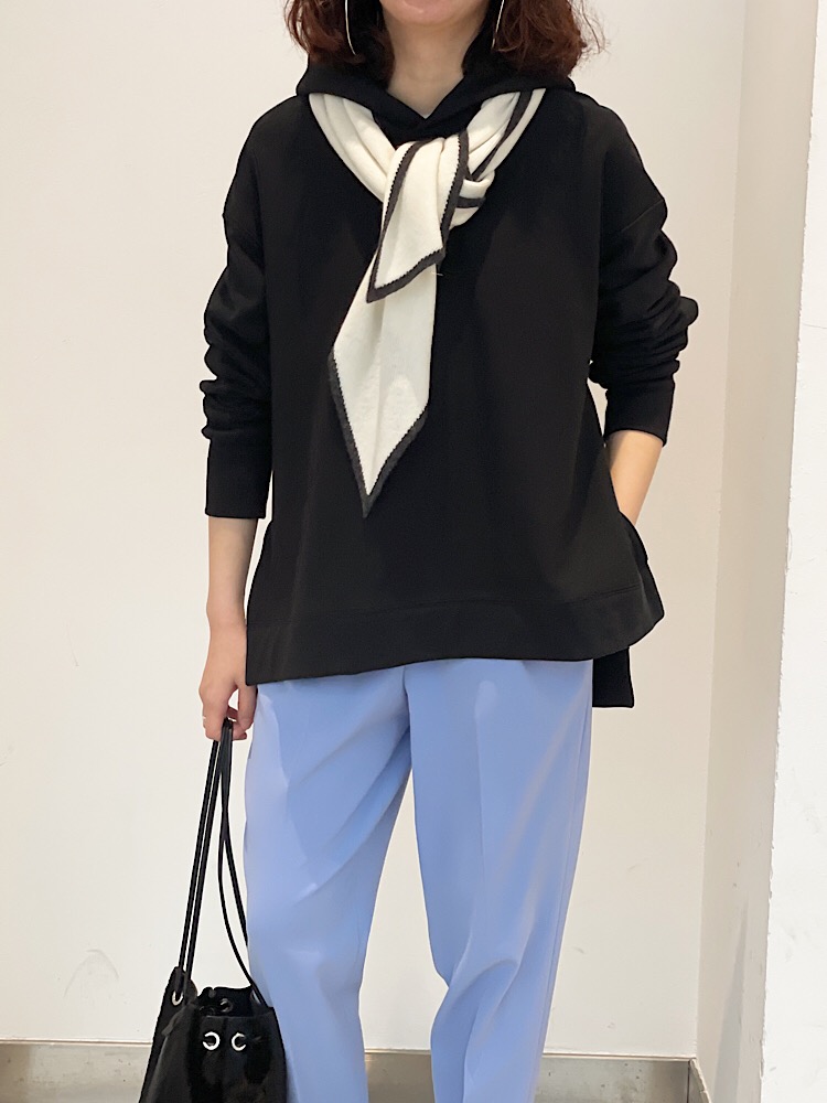 素材感・着心地:中肉の生地厚でアウターも入れやすい程よい厚さ。裏起毛ではないので春先も着やすく、サイドのスリット入りでスッキリしたシルエット。