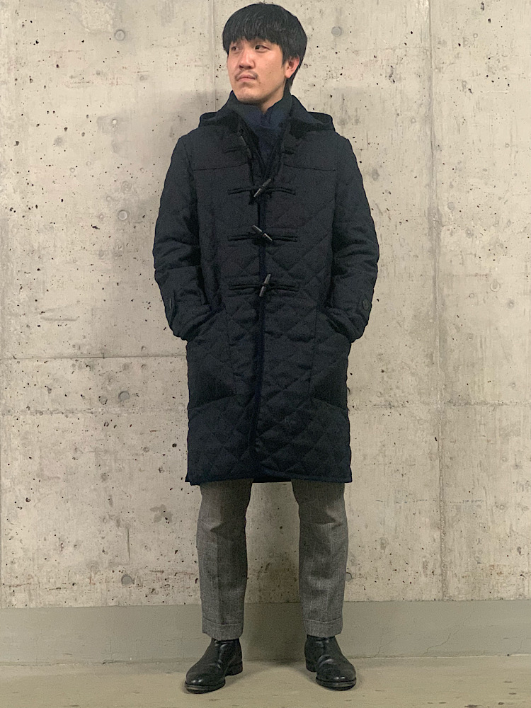 トラッドなイメージのあるダッフルコートを都会的な合わせで着用しました。