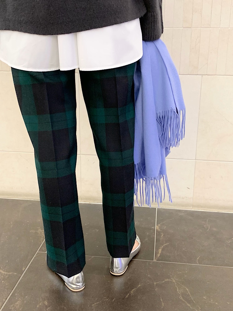肌触りの良いニットに白シャツをインして、ブラックウォッチのウールパンツを合わせたトラッドな雰囲気のスタイリングです。