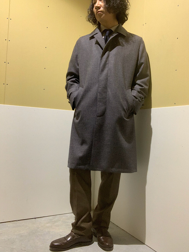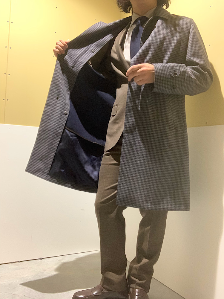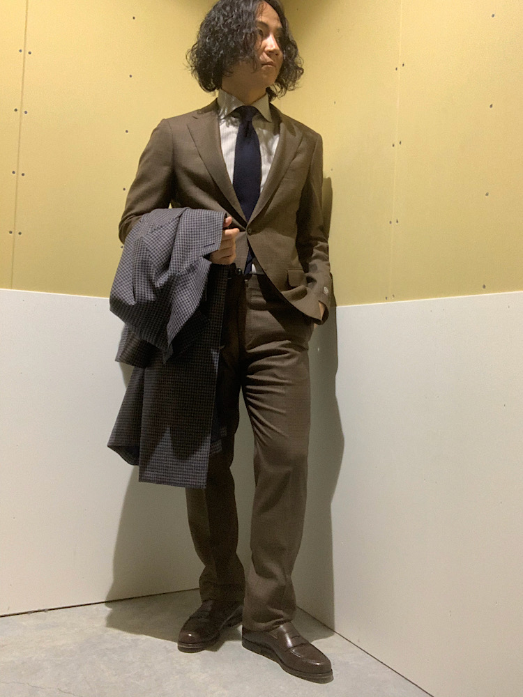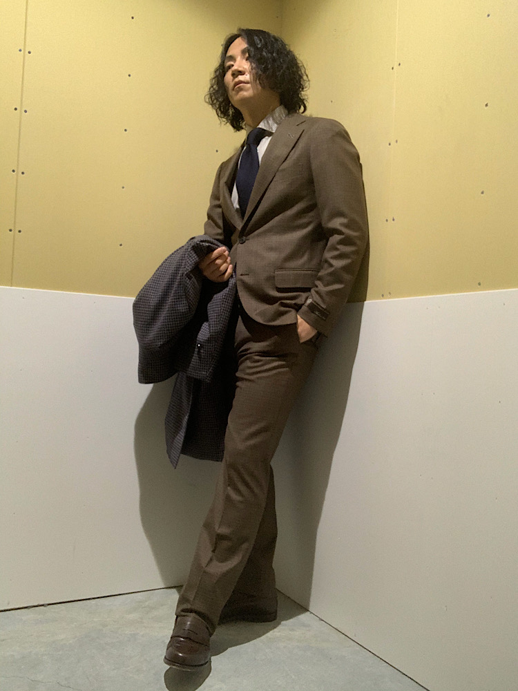 印象的なブラウンスーツと、ブラウン系のハウンドトゥースのコートで、統一感を出しながらも、ネクタイを紺にする事でやりすぎないコーディネートを意識