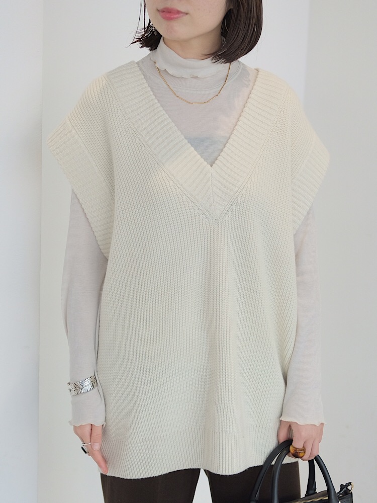 素材感・着心地:軽く、暖かいです。ワンピースやカットソー等、幅広く重ね着で着回しして頂けます。深めのVネックが幼くなり過ぎずオススメです。