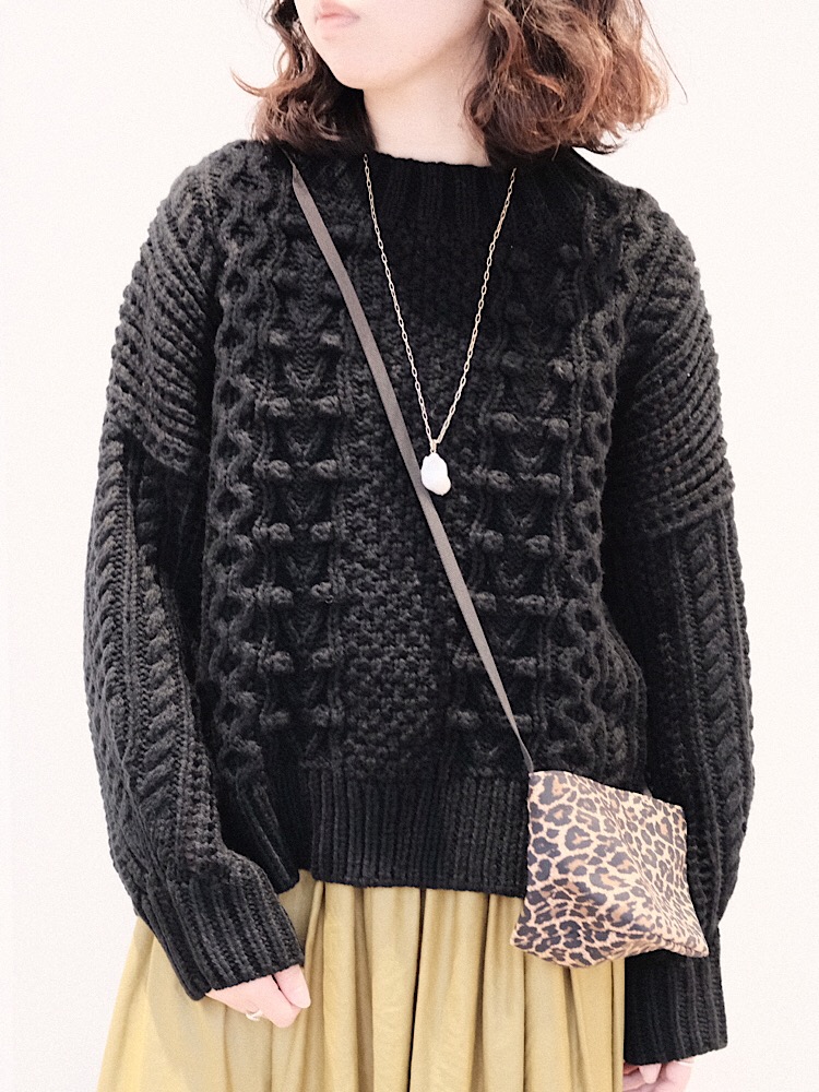素材感・着心地:ざっくり編みのケーブルニット。洗える素材で、ウエストリボンがあるのでシルエットも変えられるアイテム。