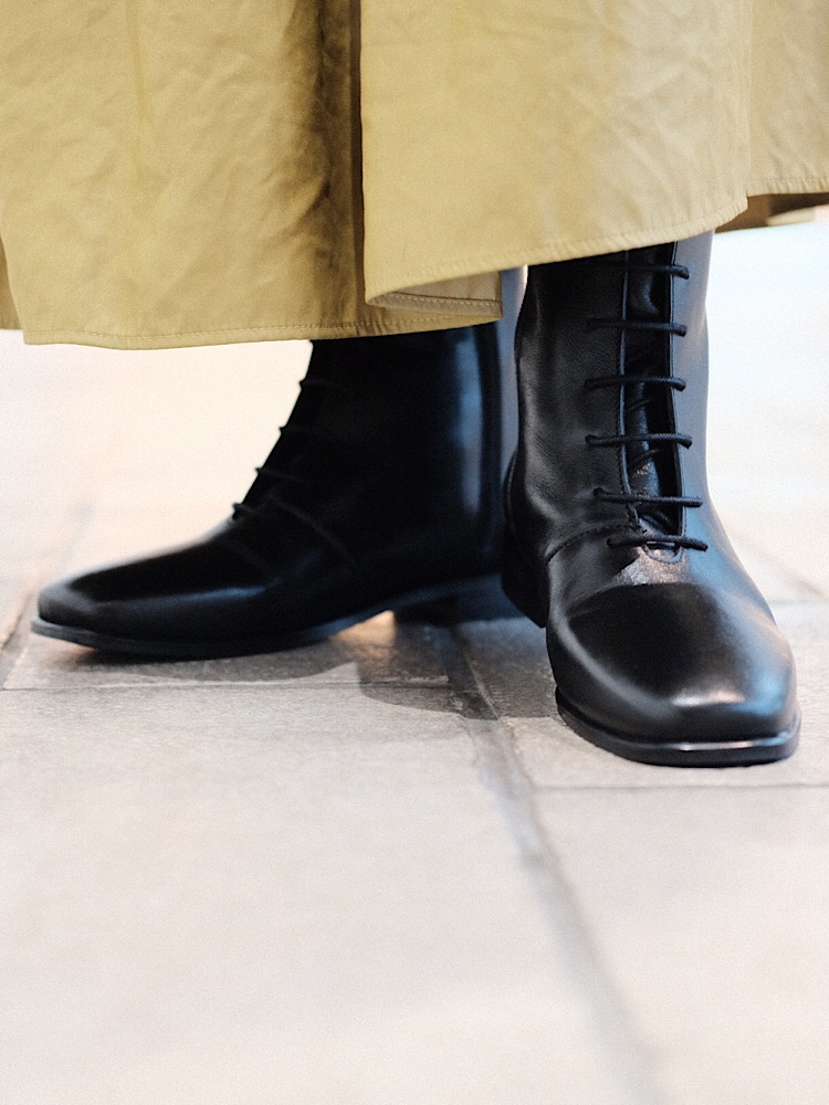 素材感・着心地:レザー見えする生地感。通年で履きやすく、ウエストゴムで楽に着られる。