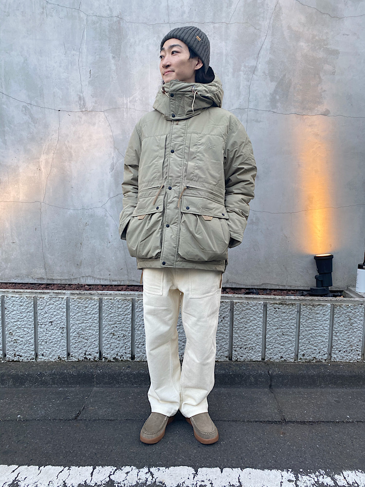 今期流行りの機能アウターとコーデュロイを使って全体的に淡い色でまとめました。