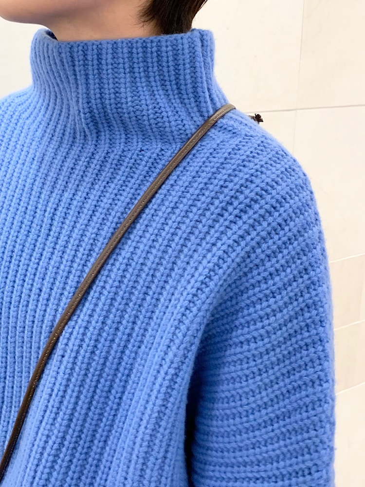 優しいブルーが綺麗なボリュームハイネックニットを、ホワイトのパンツで大人カジュアルな雰囲気にコーディネートしました。