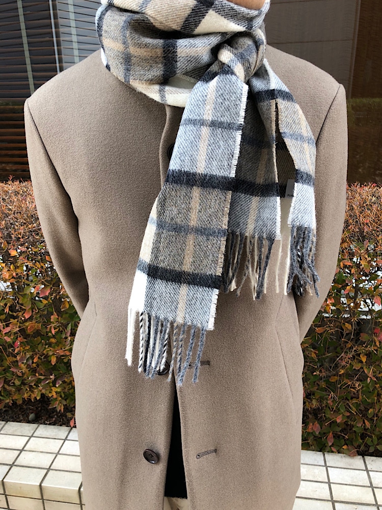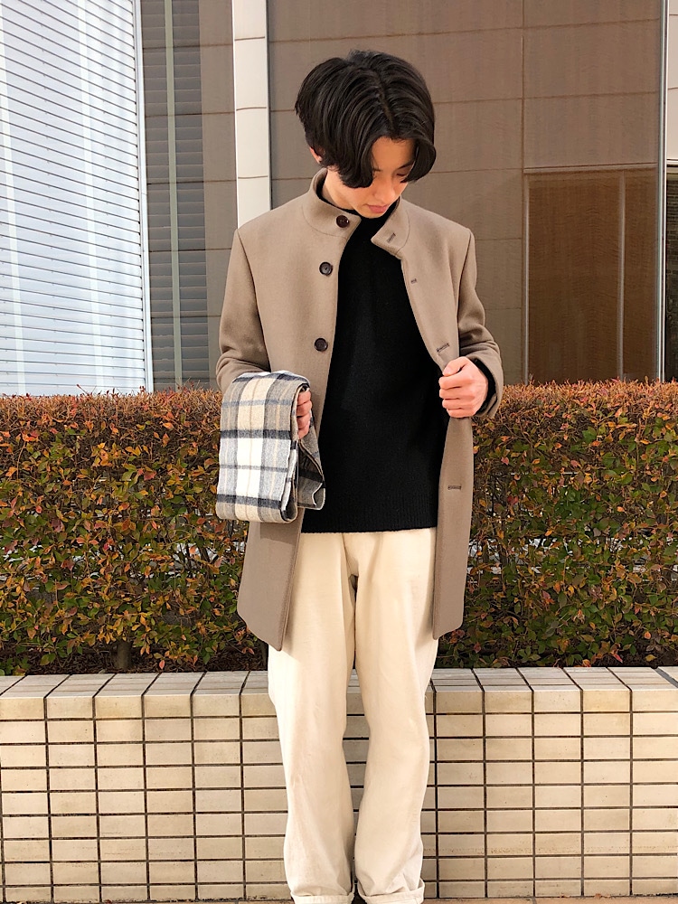 SHIPS新作のスタンドカラーコートを主役にした冬のコーディネートです。