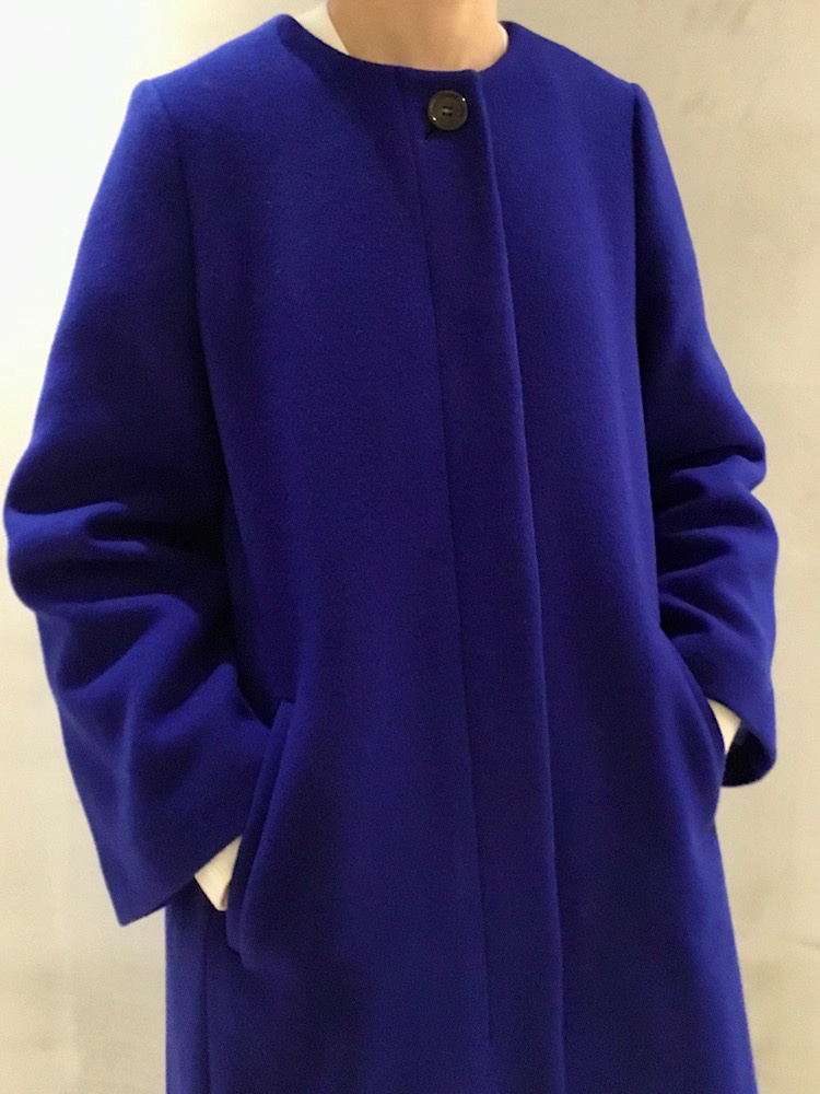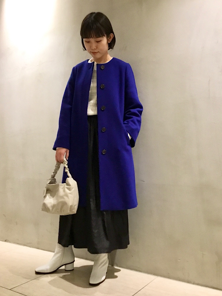 綺麗なブルーのコートを主役にした、クリスマスにもおすすめのスタイリングです。