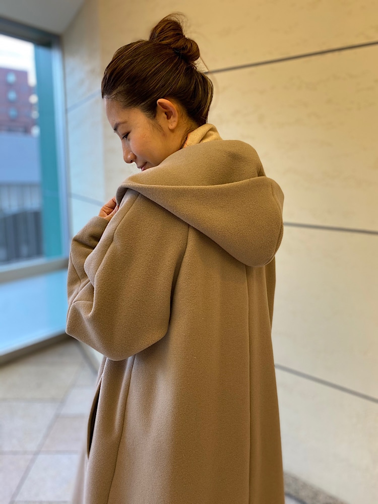 胸元から接なく流れるように付けられたフードが品の良さを醸し出す一点。