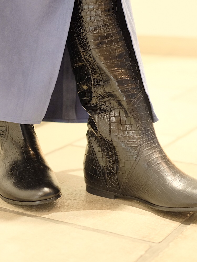 素材感・着心地:程よい光沢感のあるフェイクスエードで、スリットが入っているので足捌きも良いです。
