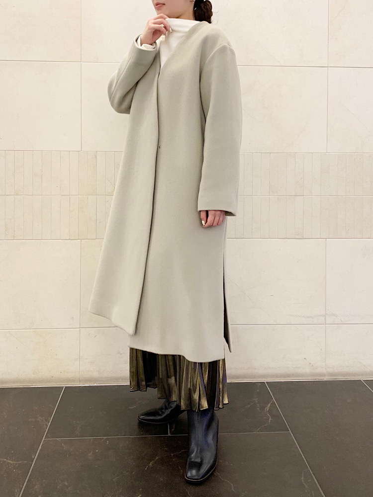 スッキリと見えるノーカラーコートにはハイネックとの相性が抜群!光沢のあるプリーツスカートで程良い色合わせ。