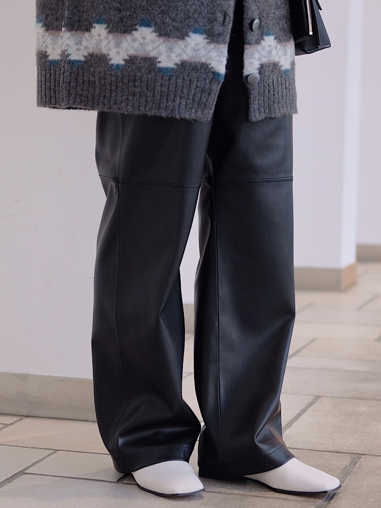 素材感・着心地:フェイクレザー素材、裏起毛なので暖かいです。ハイウエストのストレートなのでシルエットが綺麗です。
