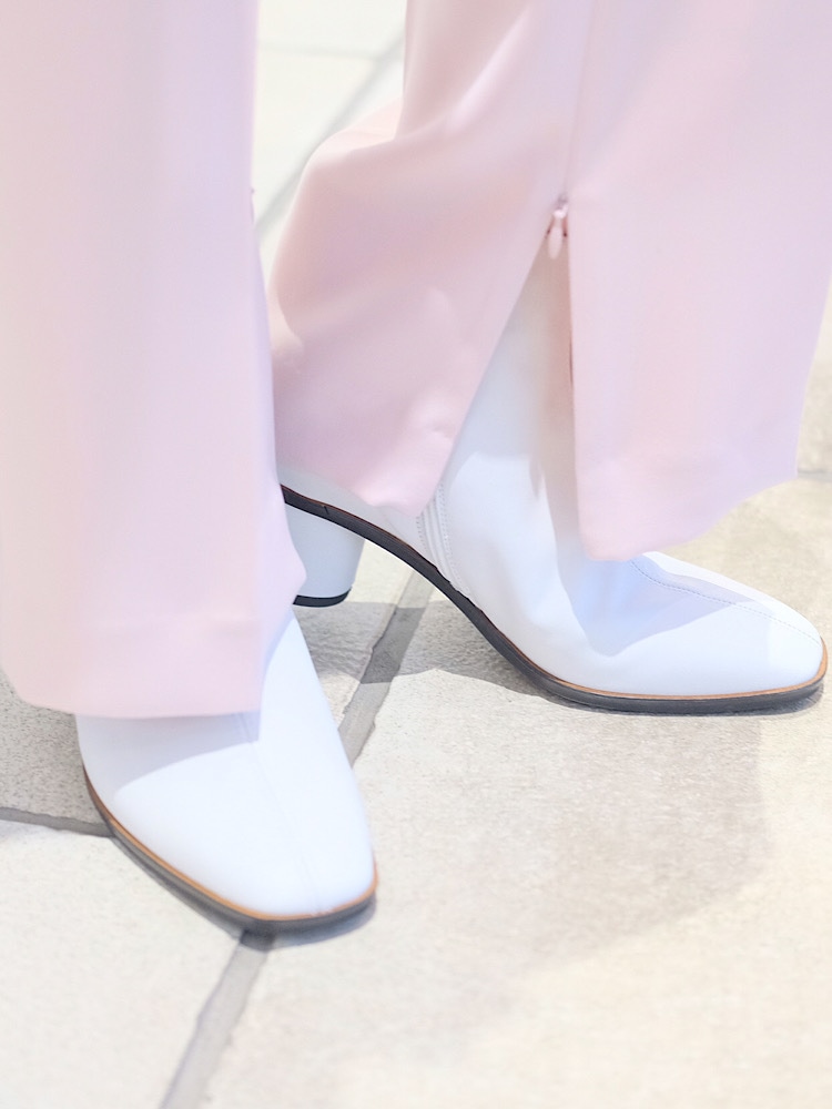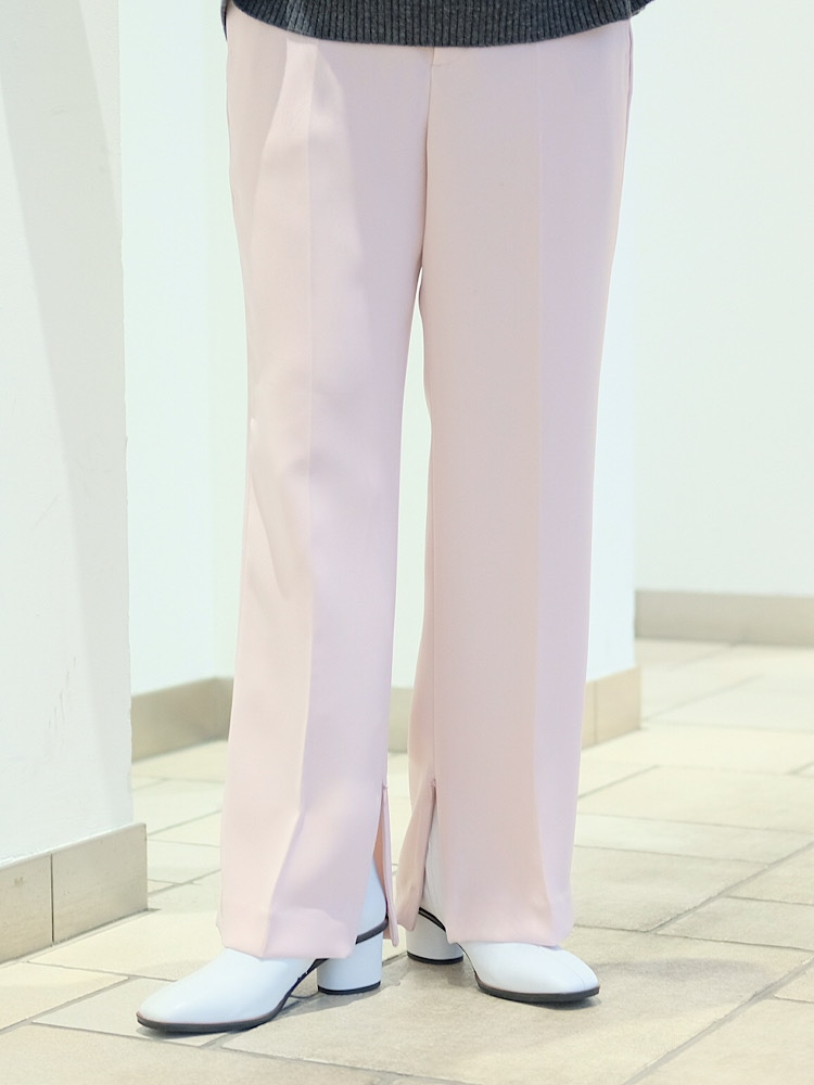 素材感・着心地:裏地ありのさらさらポリエステルパンツ。ニットとの相性もよく、内側のサイドスリットでシルエットも変えられるアイテム。
