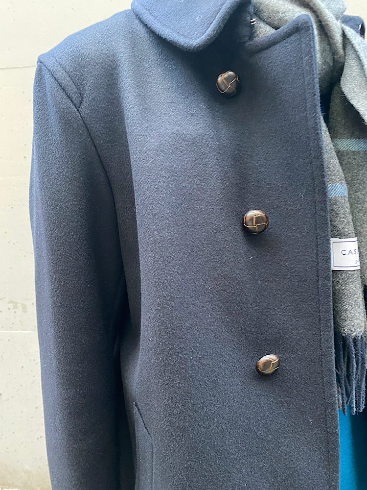 綺麗目なショートコートをラフさ感じられるようにキャップ、ゆるめなパンツ、スニーカーでカジュアルスタイリングをベースに仕上げ、鮮やかな青のニット、マフラーで清潔感も出したスタイリングです。