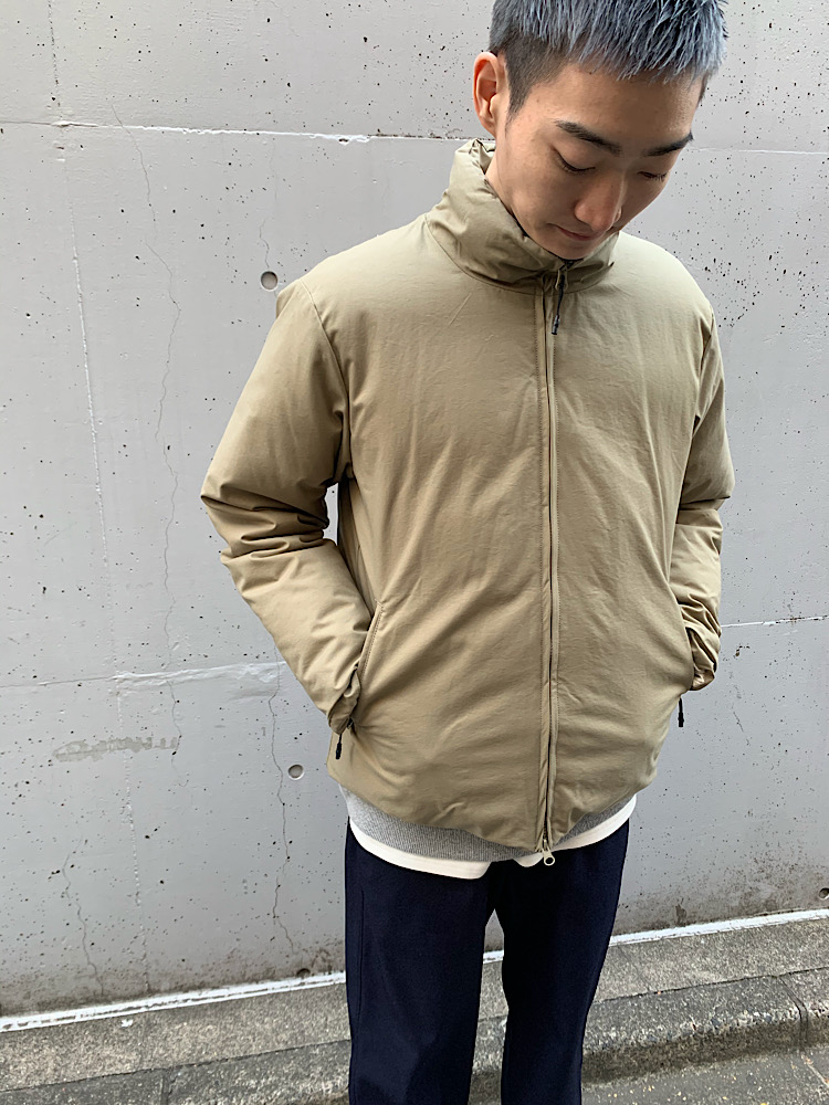 ダウンジャケットをジャストサイズにして綺麗目なスタイリングにしました。綺麗目になり過ぎずプリントロゴスウェットを白のモックネックと合わせて清潔感を出し、ネイビーのウール地のスラックスに合わせた絶妙な綺麗目ダウンジャケットスタイルです。