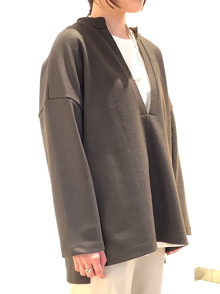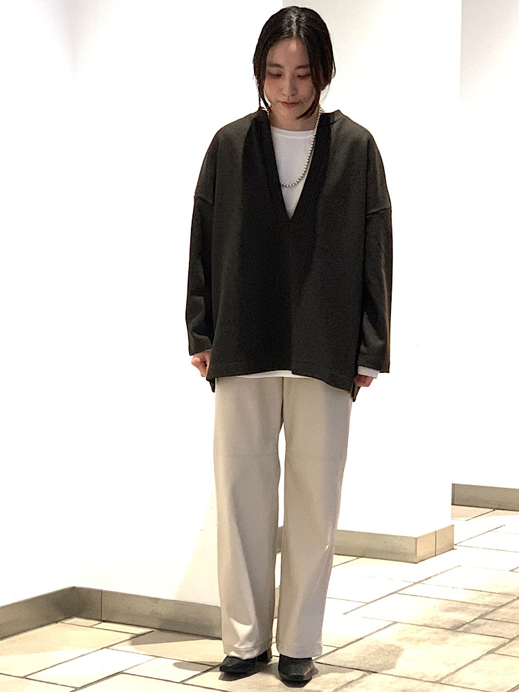 素材感・着心地:ふっくらとした生地が着心地よく、暖かい。深Vネックなので、色々なインナー合わせで着回しが楽しめます。