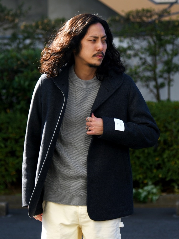 着心地:一枚に様々な編地を用いることで他にはない表情のある生地感なので、一枚でもインナーでも映える一着。