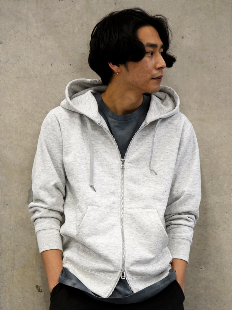 羽織りにも最適なスウェットジップパーカーのスポーティーなコーデ。