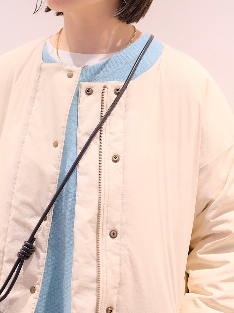 素材感・着心地:ダウンなので軽く、暖かいです。リバーシブルでご着用可能なのと、同素材のマフラーが付属しているので雰囲気を変えて、着て頂けます◎