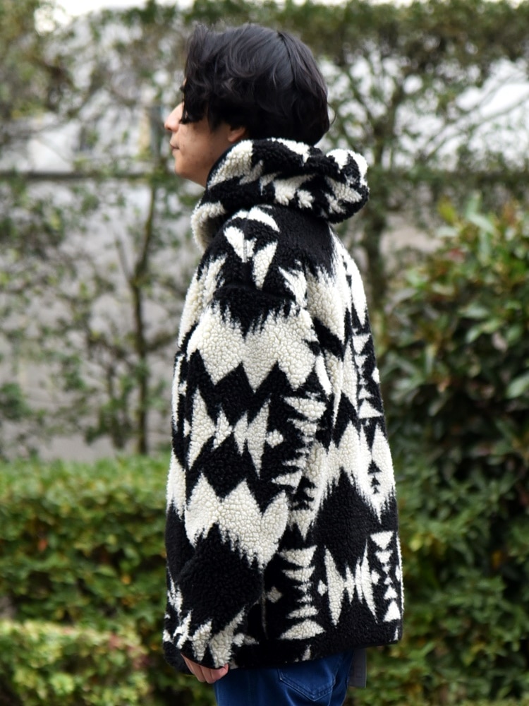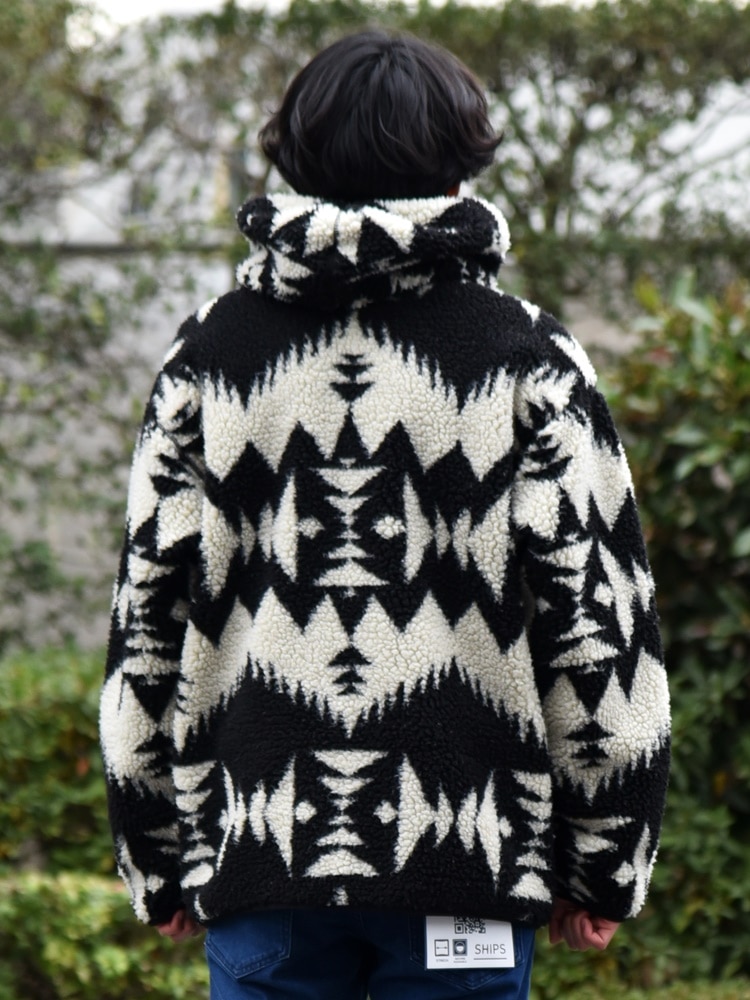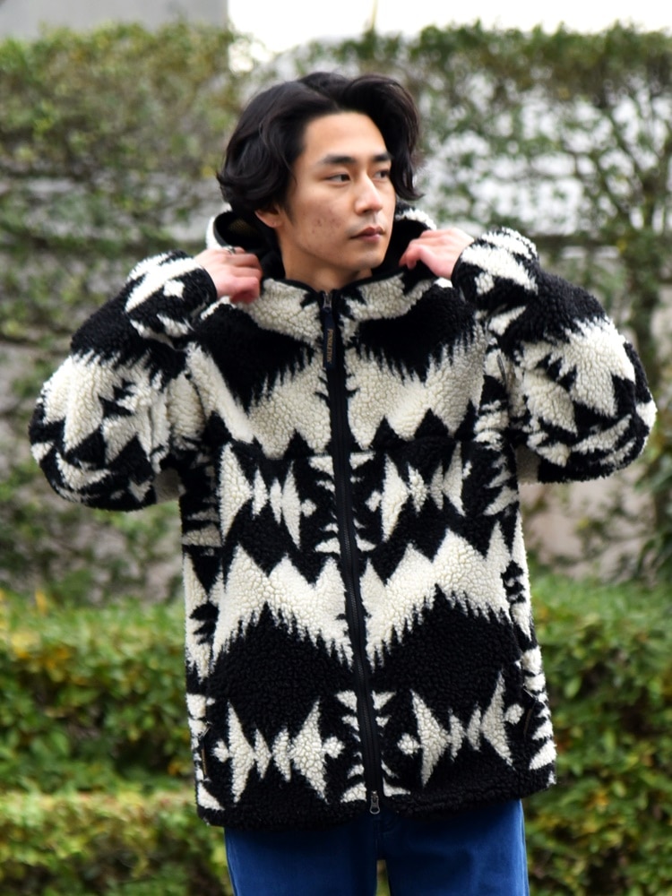 PENDLETONの伝統的な織り柄が目を引くビッグシルエットのボアフリースフードブルゾンを使ったコーディネート。