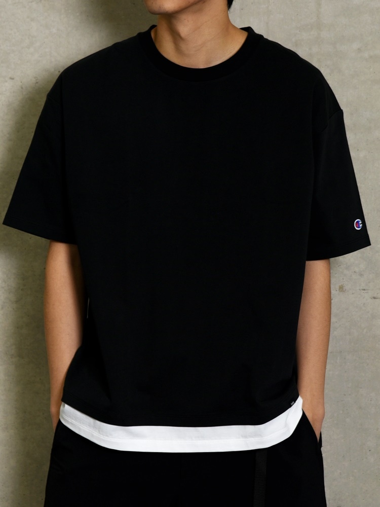 Champion×SHIPSの一枚でこなれた雰囲気を演出できるフェイクレイヤードTシャツと、