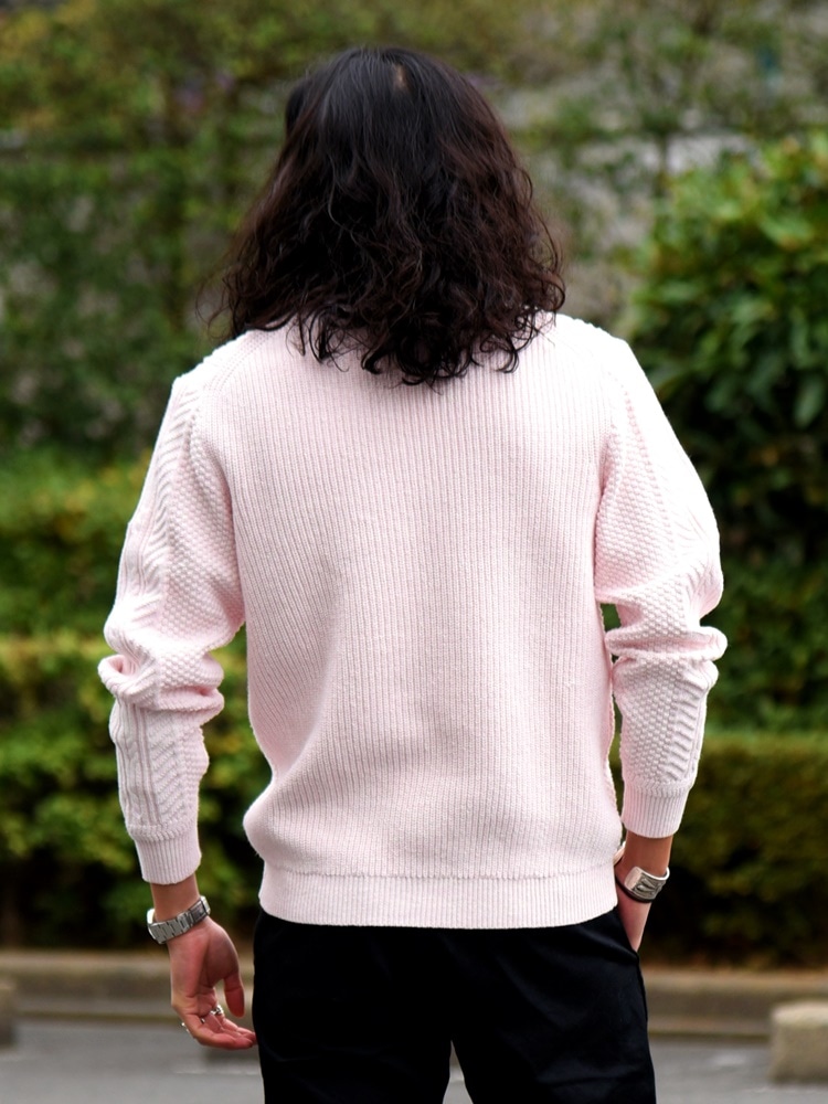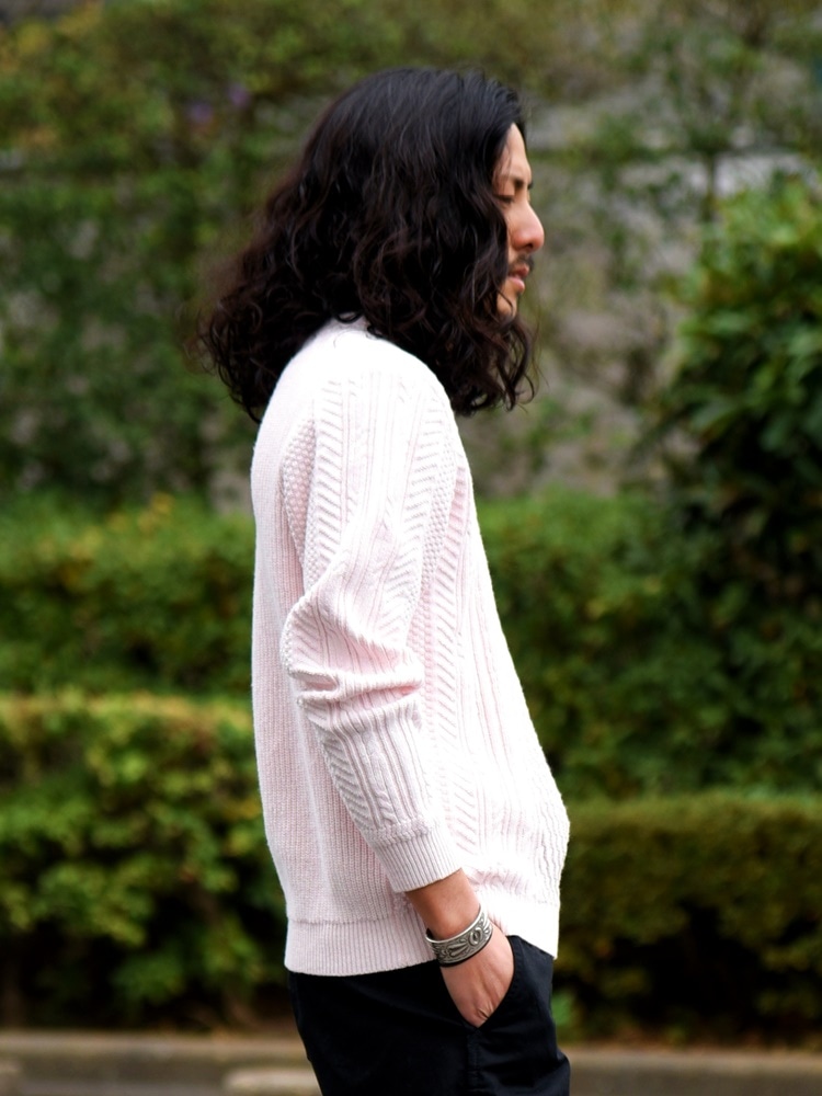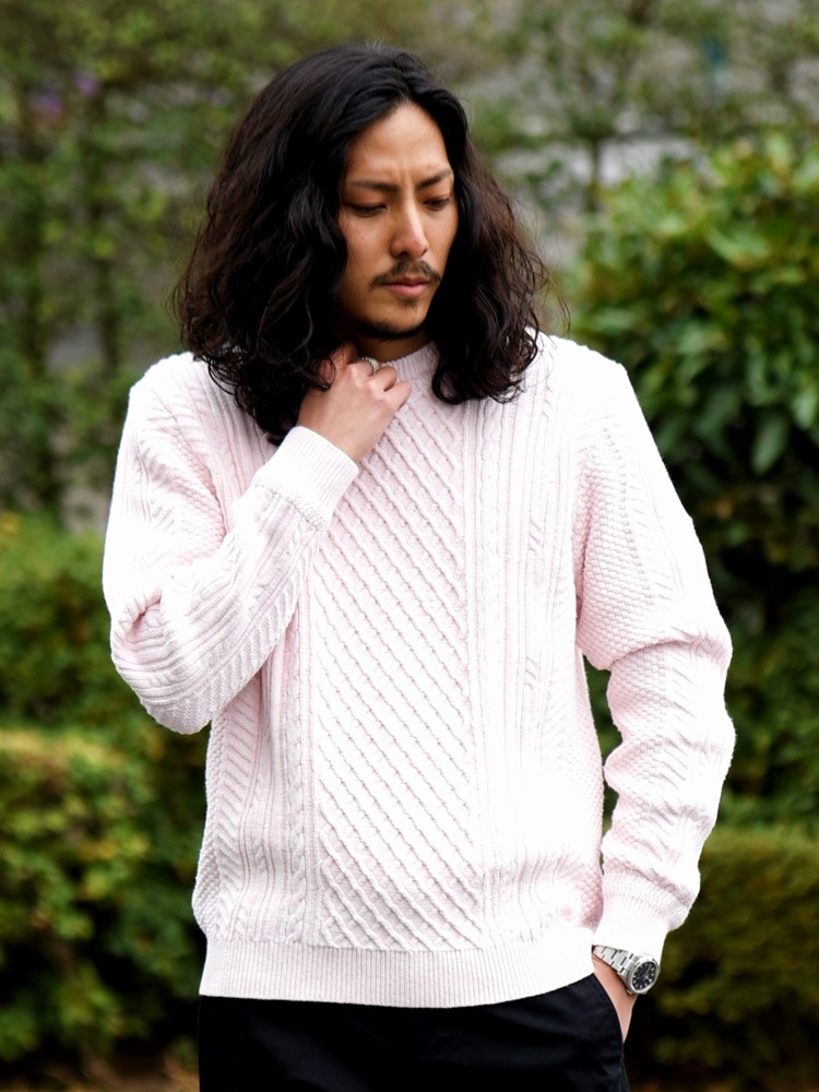 絶妙なバランスで施されたフィッシャーマンパターンが特徴的なミドルゲージのクルーネックニット