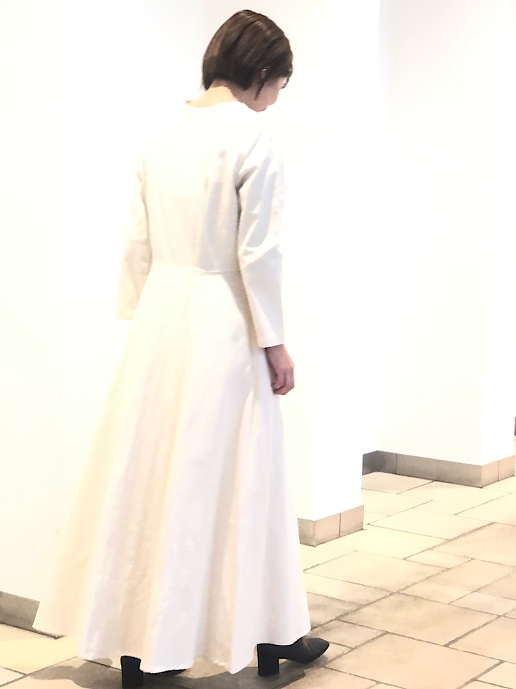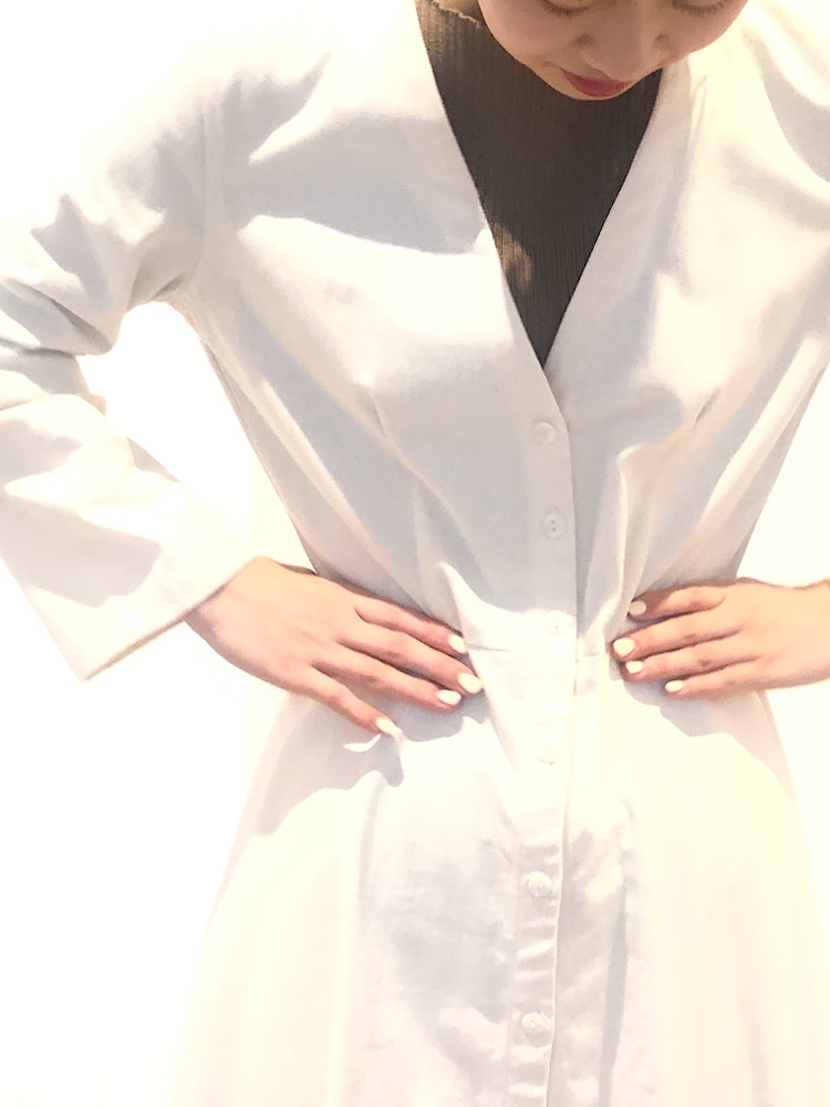 素材感・着心地:ウエストよりやや上部でシェイプされておりスッキリしたシルエット。深めのVネックなのでよりスッキリした印象になります。