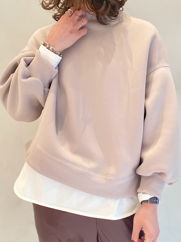 サイズ感:ドロップショルダーで、肩周りはゆったりしている。裾と袖に程よいボリューム感あり。