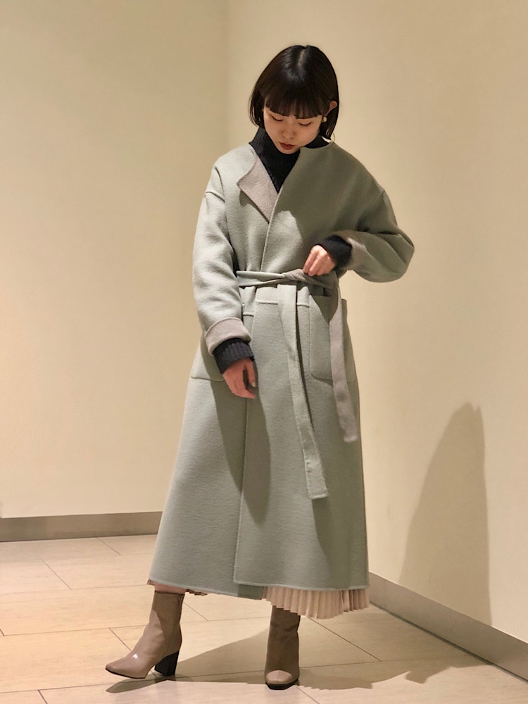 ゆったりとしたサイズ感のコートですが女性らしいアイテムを合わせることで、バランス良く着て頂けます。