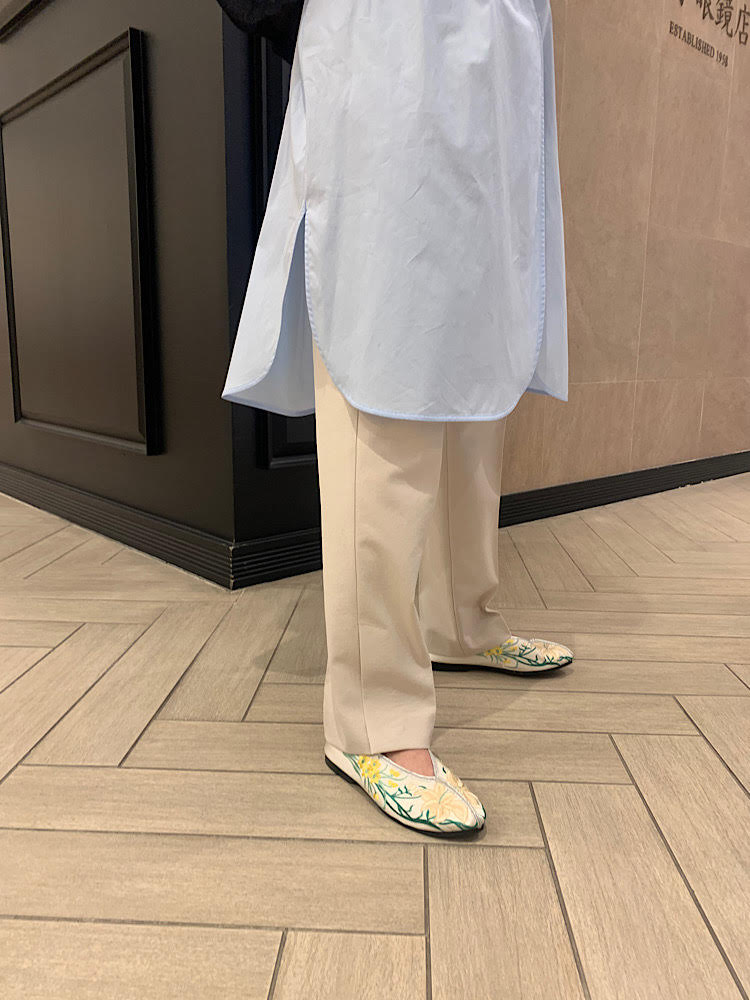 素材感・着心地: トリアセテート×ポリエステル素材なので肌当たりが良く着心地抜群です。スリット入りなのでスッキリした足元を演出できます!
