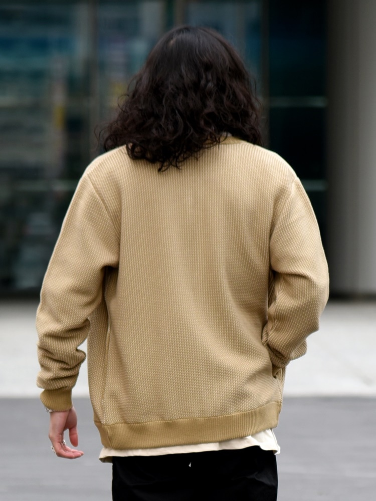 素材感:均一でムラの無い綺麗な編み目、2色の糸を用いて編むことで生地の立体感、表情を引き出したこだわりのニット生地。抗菌・防臭に加え洗濯も可能。