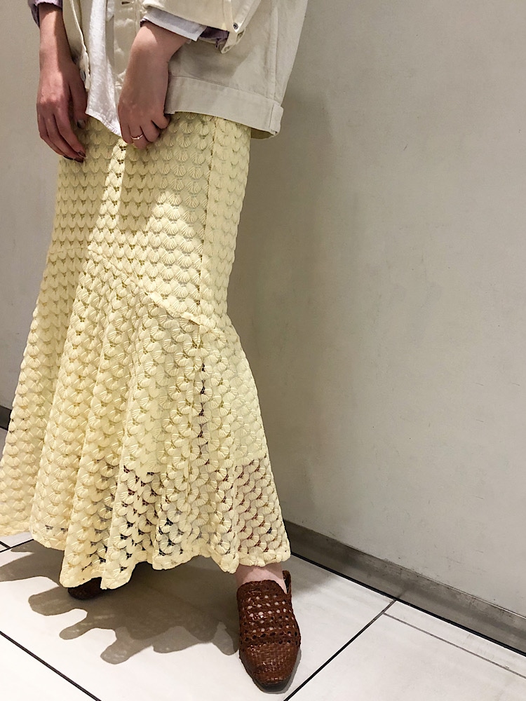 着心地:ロングのマーメイドスカートですが、ストレッチも効いていて歩きやすいです。1枚でも、ワンピースに重ねても合わせやすそう。