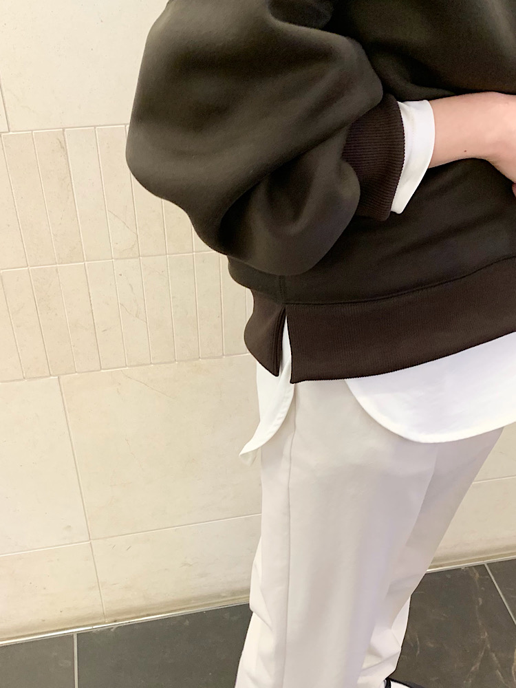 サイズ感:肩が大きく落ちたオーバーサイズ。首元は程よく詰まっています。