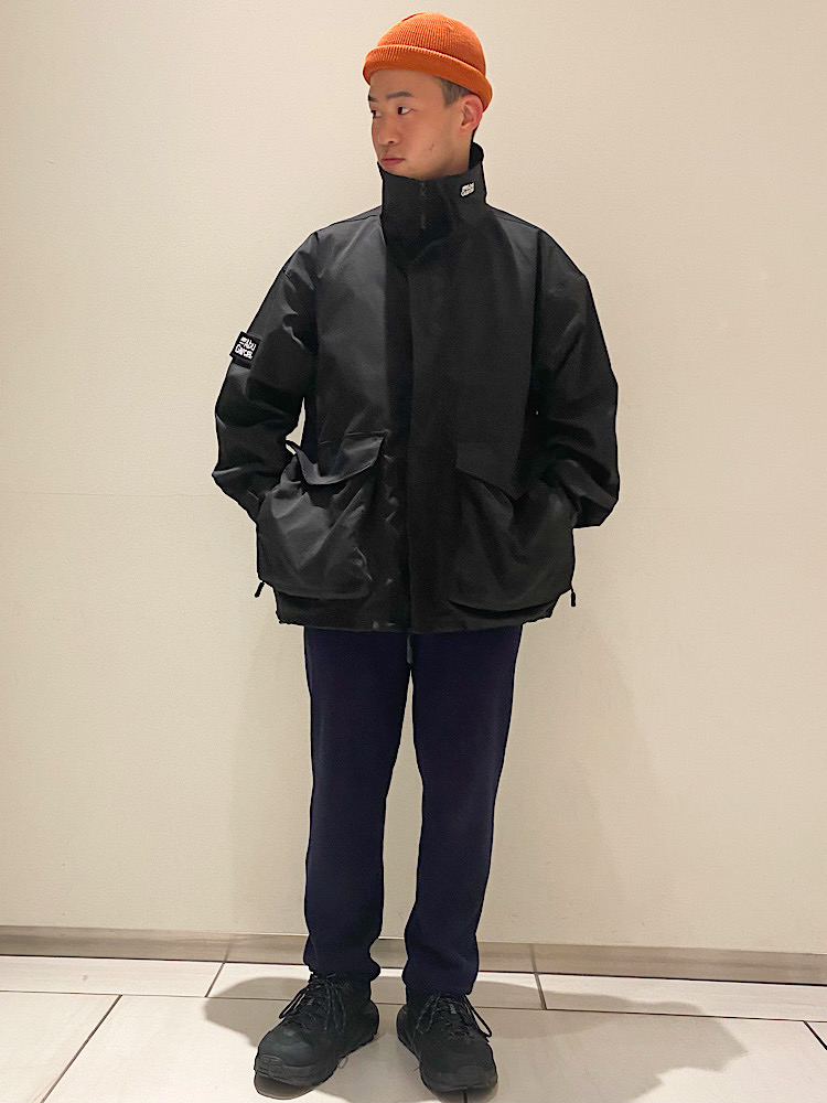 ルームウェアのパンツをアウトドアのジャケットと合わせたラフなスタイル