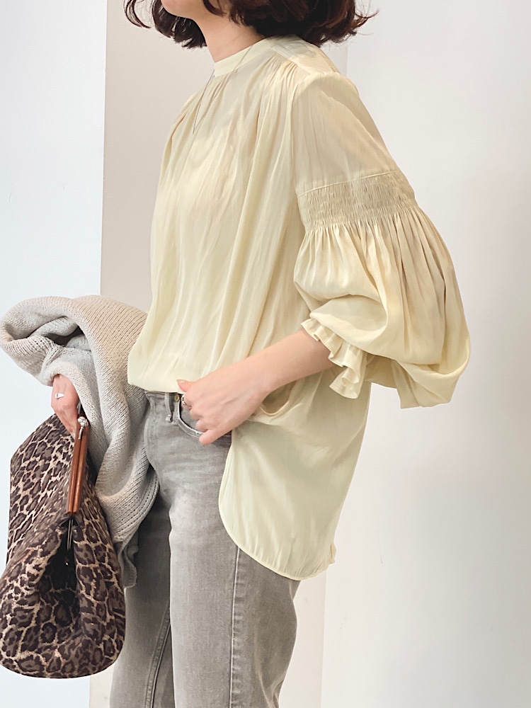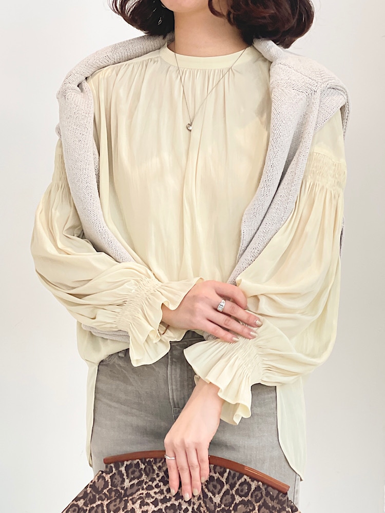 素材感・着心地:前後2wayでの着用ができるギャザーブラウス。お袖をまくるとバルーンスリーブのようなボリュームで一枚でも存在感あるシルエット。やや透けるのでインナー必須。