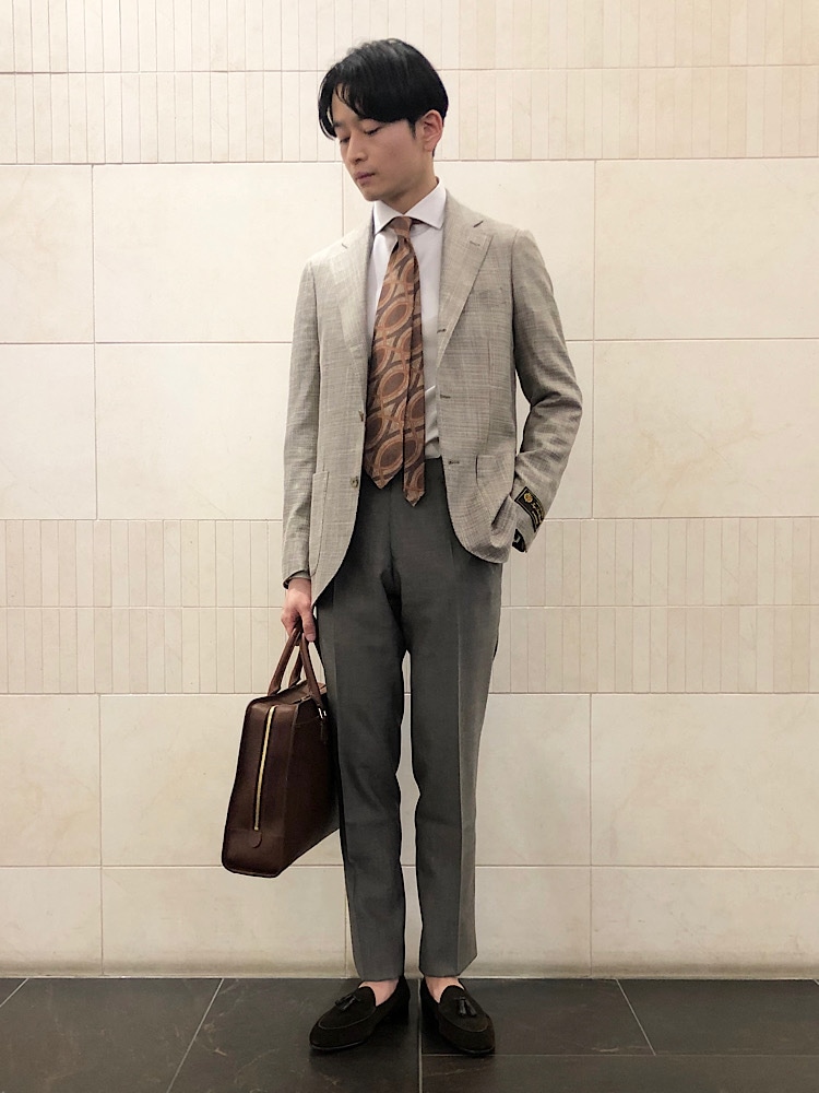 【着用レビュー 】全身をブラウン・カーキ系でまとめたコーディネートです。ジャケットの素材感や、シャツの色味に明るい色を持ってくることで、ブラウン系の合わせでも春っぽく仕上がったと思います。