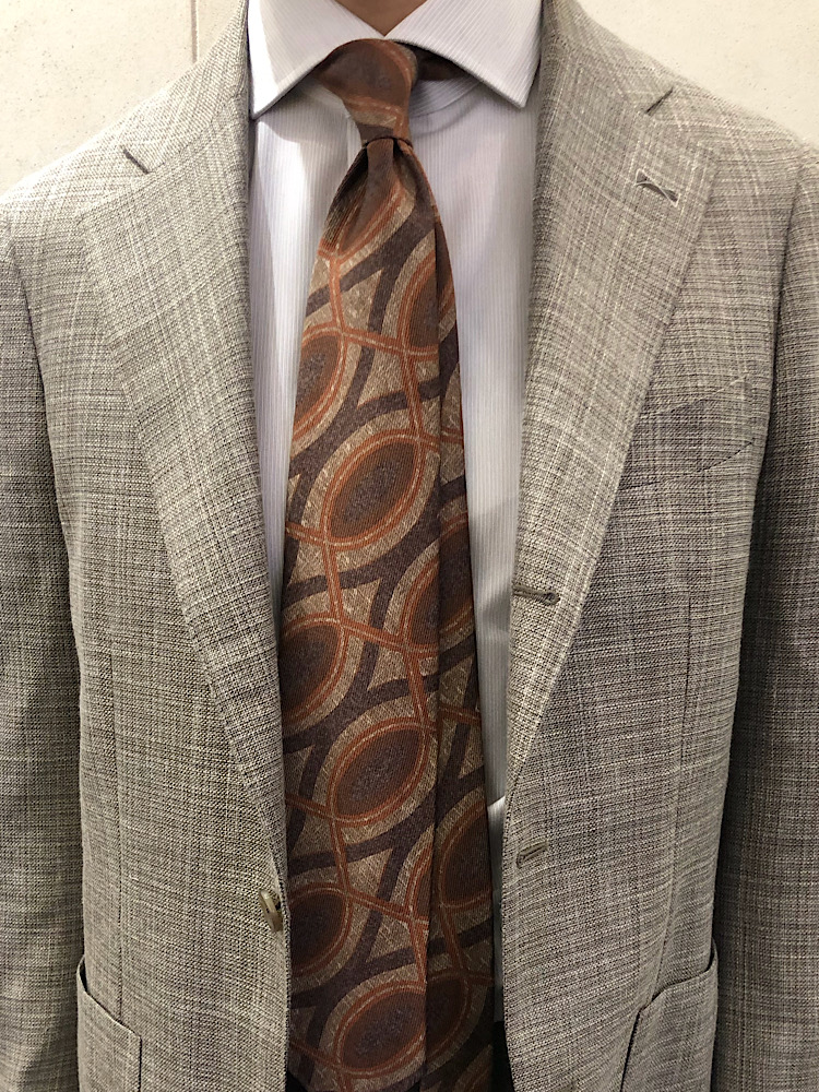 素材感:ウール・シルクの混紡素材。麻っぽい杢調の素材感が春〜夏の装いにマッチします。