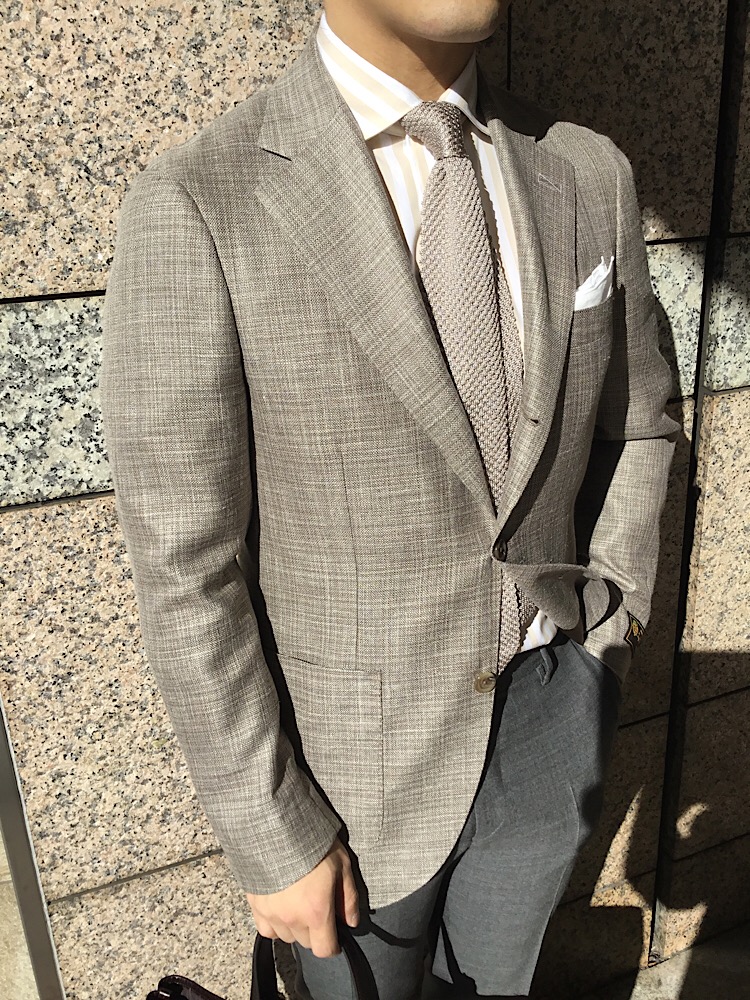 今年のビジネスカジュアルは淡い色合わせを中心にスタイリングしました。ネクタイやバック、シューズは柔らかな印象で小物を工夫しています。