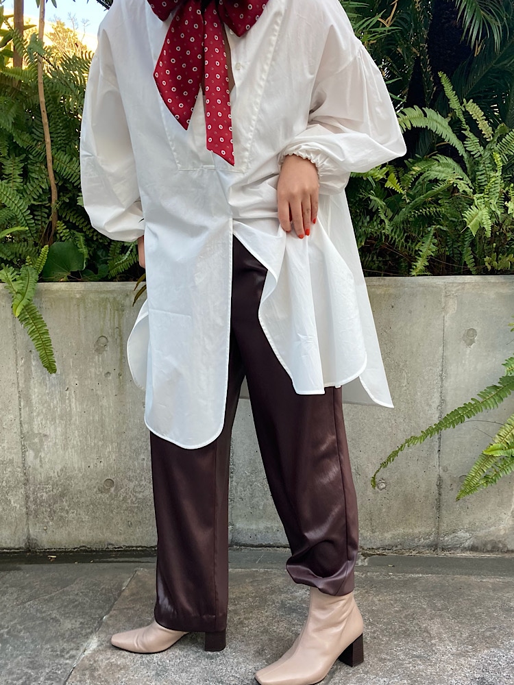 綿素材の爽やかなチュニックシャツをサテンパンツで上品にアップデート。