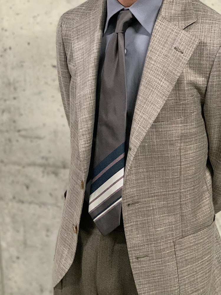 【着用レビュー】 グレー×ベージュが新鮮に感じる組み合わせかと思います。定番のサックスやホワイトでは無くグレーのシャツを、ブラウンでなくベージュとグレーが混ざったネクタイとシューズを使用する事で懐かしくも新鮮なスタイリングになったと感じます。 着用アイテム : ジャケット 身長 :171p / 普段サイズ : S着用サイズ : 44 素材感 : ウール・シルク・リネンの棍棒素材 涼しげで軽い印象がありながらハリのある生地感のためシワになりづらい性質も持ちます。 着心地 :かなり軽い着用感でありながら作りが良いためしっかり胸を張ったように見える。 またシルク特有のひんやりとした肌触りが心地良くSUMMER TIMEの名の通り春から夏にピッタリな商品だと感じます。